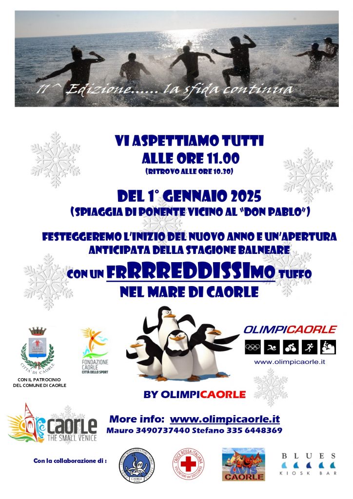 ………. la sfida continua ………. dopo il successo della decima edizione che ha visto oltre 120 temerari affrontare le gelide acque dell’Adriatico per iniziare in modo diverso il nuovo anno, OLIMPICAORLE, con il patrocinio del Comune di Caorle, la collaborazione del locale gruppo sommozzatori e della C.R.I., ha deciso di riproporre la sfida a, organizzando l’ 11^ edizione del “CIMENTO” il primo gennaio 2025. Via spettiamo pertanto ancora più numerosi per…